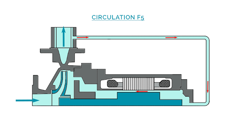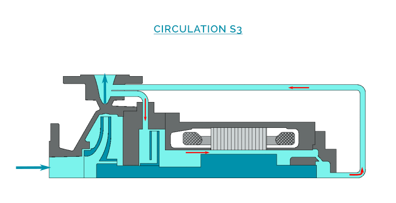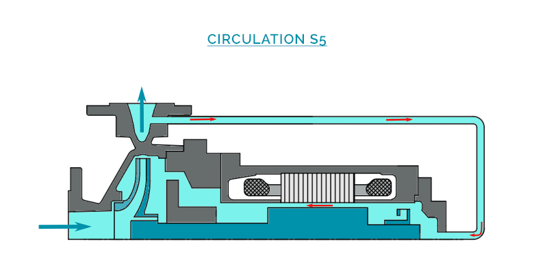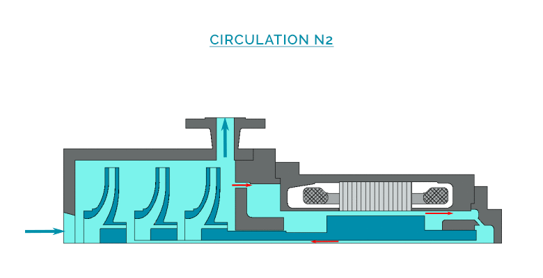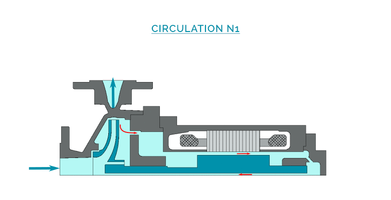 A part of the liquid called « process flow » is discharged through a double casing around the motor, in order to evacuate the calories externally, and to complete the cooling of the internal circulation. A second part of the liquid is injected in the motor from the hydraulic casing (at the impeller periphery), then circulates through the gap, and is re-injected to the process flow at the front support bearing.