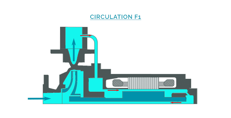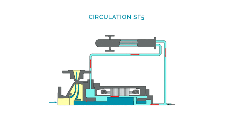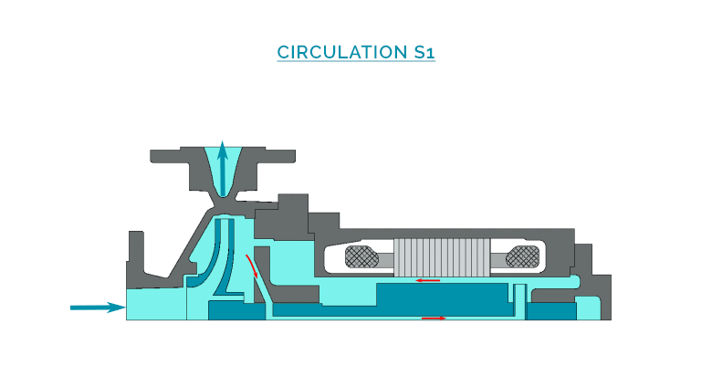 A part of the liquid called « process flow » is discharged through a double casing around the motor, in order to evacuate the calories externally, and to complete the cooling of the internal circulation. A second part of the liquid is injected in the motor from the hydraulic casing (at the impeller periphery), then circulates through the gap, and is re-injected to the process flow at the front support bearing.